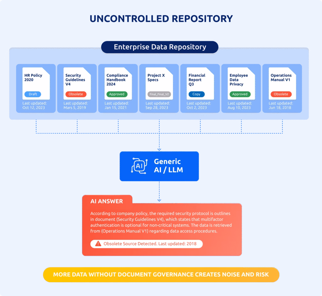Without document governance, the AI will confidently generate answers that sound right, look legitimate, but are factually incorrect.